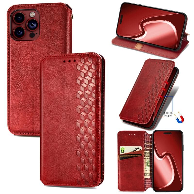 Θήκη τηλεφώνου από δέρμα με μαγνητική έλξη και ανάγλυφο σχέδιο κυβικού πλέγματος για iPhone 15 Pro Max (Κόκκινο)