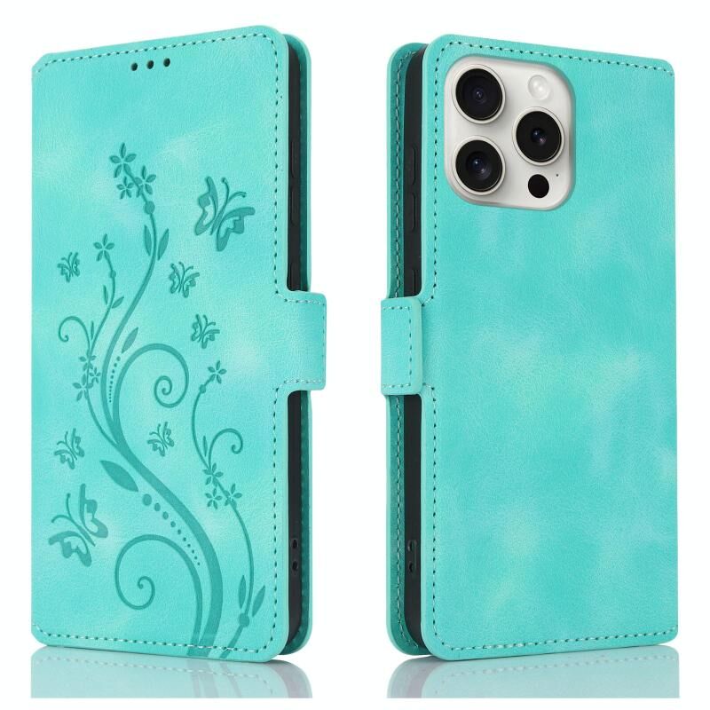 Θήκη τηλεφώνου από δέρμα με ανάγλυφο σχέδιο πεταλούδας και λουλουδιών για iPhone 15 Pro Max (Χρυσαφί Ροζ)
