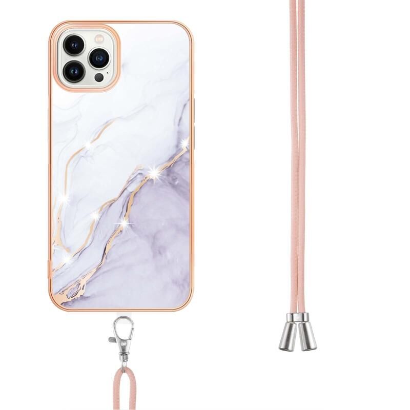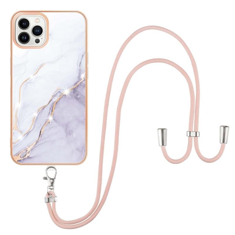 Θήκη για iPhone 15 Pro Max με Επικάλυψη Ηλεκτρολυτικής Μαρμάρου, Τεχνολογία IMD, Αντικραδασμική από TPU με Λουρί Λαιμού (Μωβ 001)