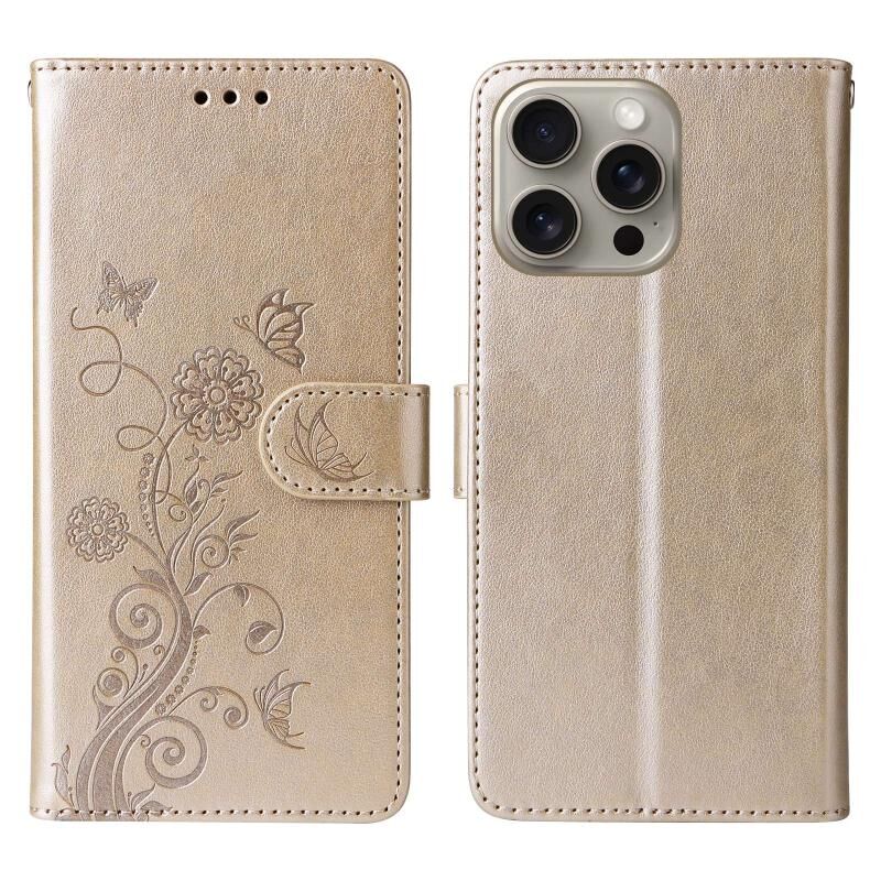 For iPhone 15 Pro Max Embossed Butterfly Flowers Leather Phone Case(Gold)