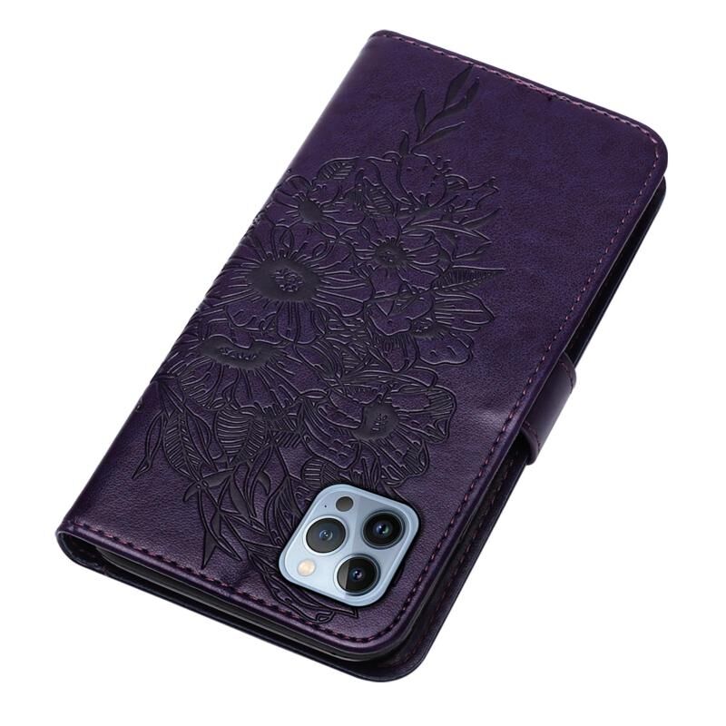 Θήκη τηλεφώνου από δέρμα με ανάγλυφο σχέδιο πεταλούδας για iPhone 15 Pro Max (Σκούρο Μωβ)