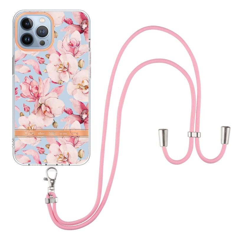 Θήκη τηλεφώνου IMD TPU για iPhone 15 Pro Max, σειρά Λουλούδια και Φυτά, με κορδόνι (Μωβ Παιώνια)