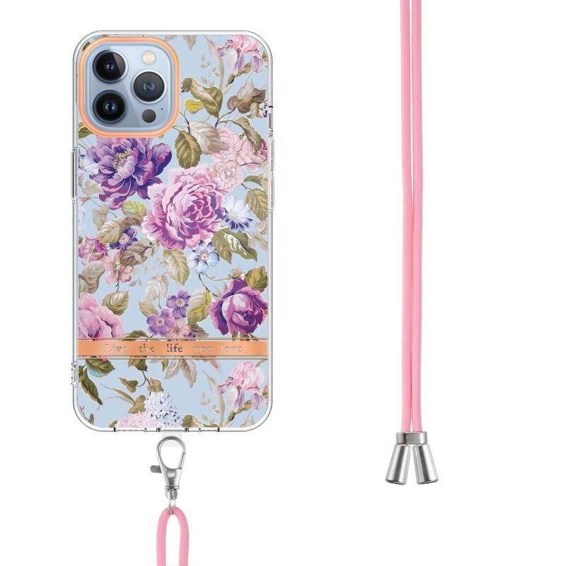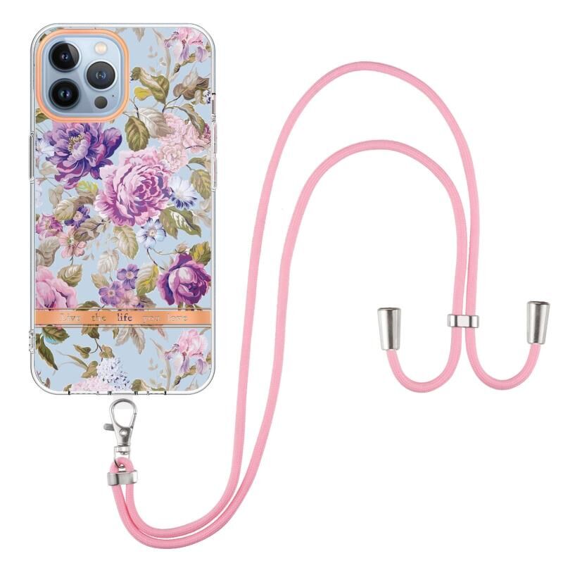 Θήκη τηλεφώνου IMD TPU για iPhone 15 Pro Max, σειρά Λουλούδια και Φυτά, με κορδόνι (Μωβ Παιώνια)