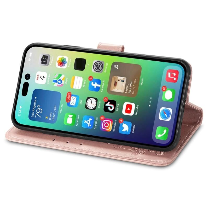 Θήκη τηλεφώνου από δέρμα με ανάγλυφο κούμπωμα σε σχήμα τριφυλλιού για iPhone 15 Pro Max (Χρυσορόδινο)