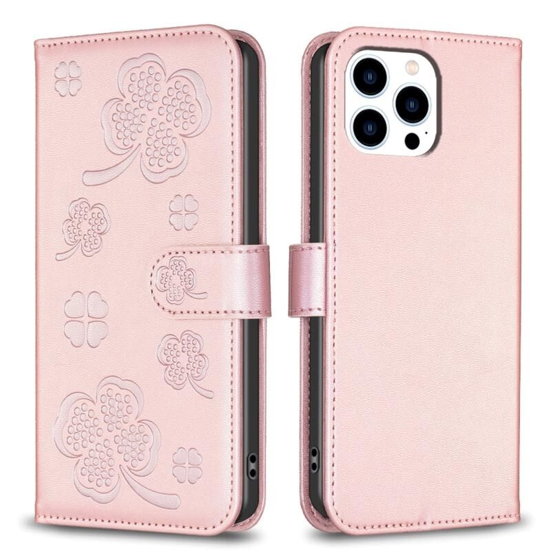 Θήκη τηλεφώνου από ανάγλυφο δέρμα με τετράφυλλο τριφύλλι για iPhone 15 Pro Max (ρόζ)
