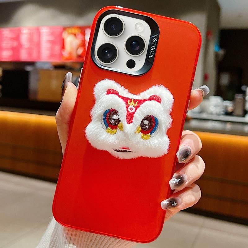 Θήκη τηλεφώνου για iPhone 15 Pro Max, βελούδινη κούκλα Λιοντάρι του Χορού της Πρωτοχρονιάς (Κόκκινη πλάτη, Λευκό Λιοντάρι)