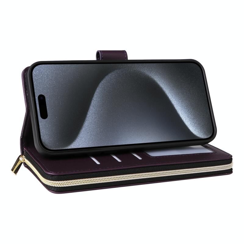 Θήκη τηλεφώνου από δέρμα με θήκη πορτοφολιού με φερμουάρ και εννέα θέσεις για κάρτες για iPhone 15 Pro Max (Κρασί)