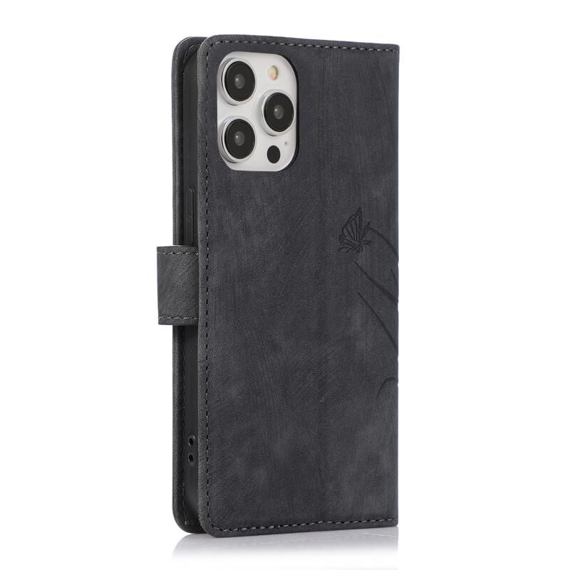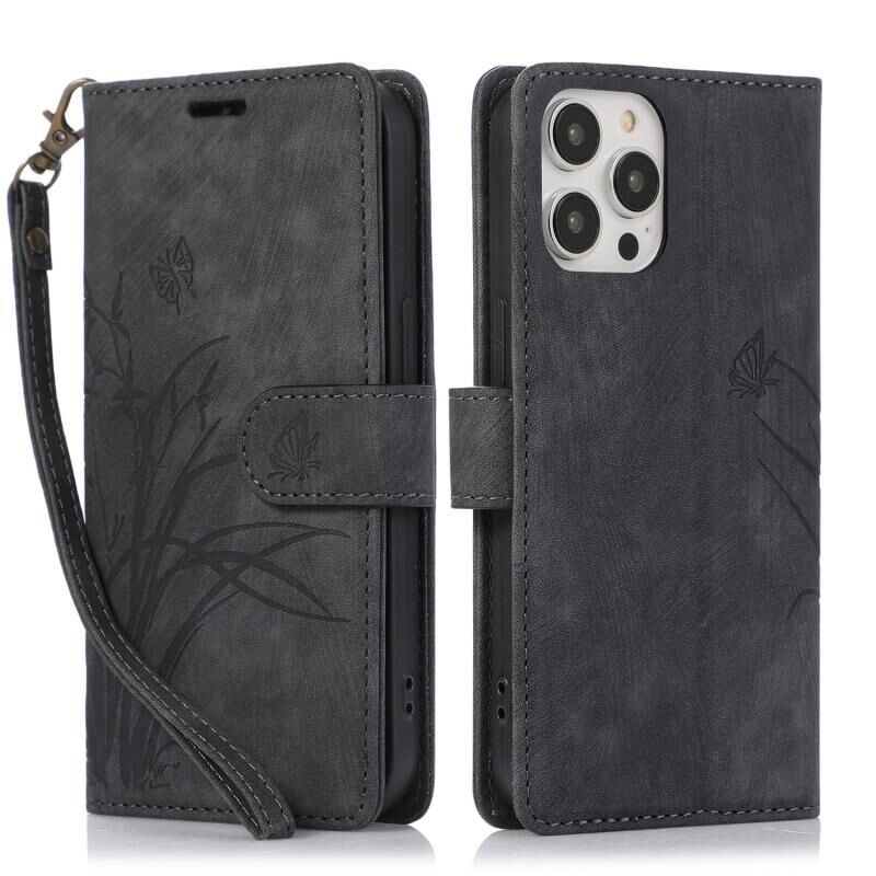 Θήκη τηλεφώνου από δέρμα με ανάγλυφο σχέδιο ορχιδέας και πεταλούδας για iPhone 15 Pro Max (Μαύρο)