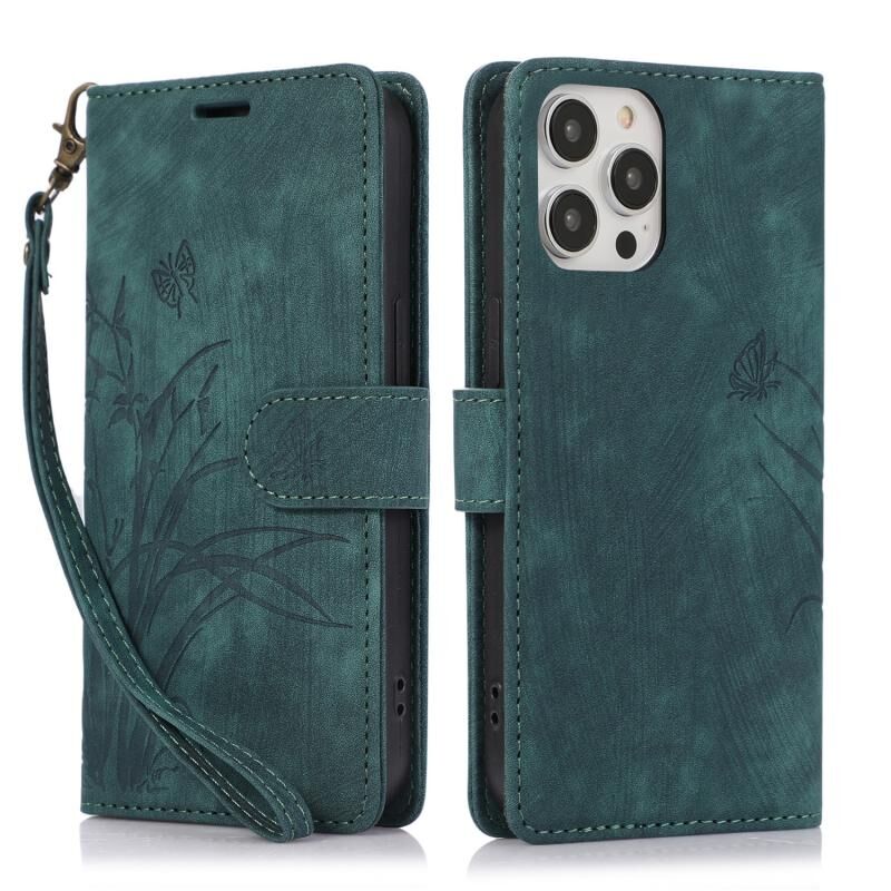 Θήκη τηλεφώνου από δέρμα με ανάγλυφο σχέδιο ορχιδέας και πεταλούδας για iPhone 15 Pro Max (Μαύρο)