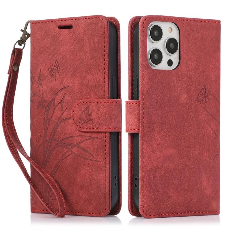 For iPhone 15 Pro Max Orchid Butterfly Embossed Leather Phone Case(Red)