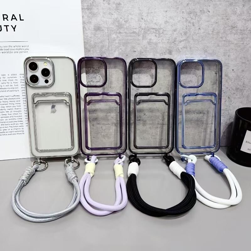 Θήκη τηλεφώνου από διάφανο TPU με επιμετάλλωση για iPhone 15 Pro Max με υποδοχή κάρτας & λουρί (Μωβ)
