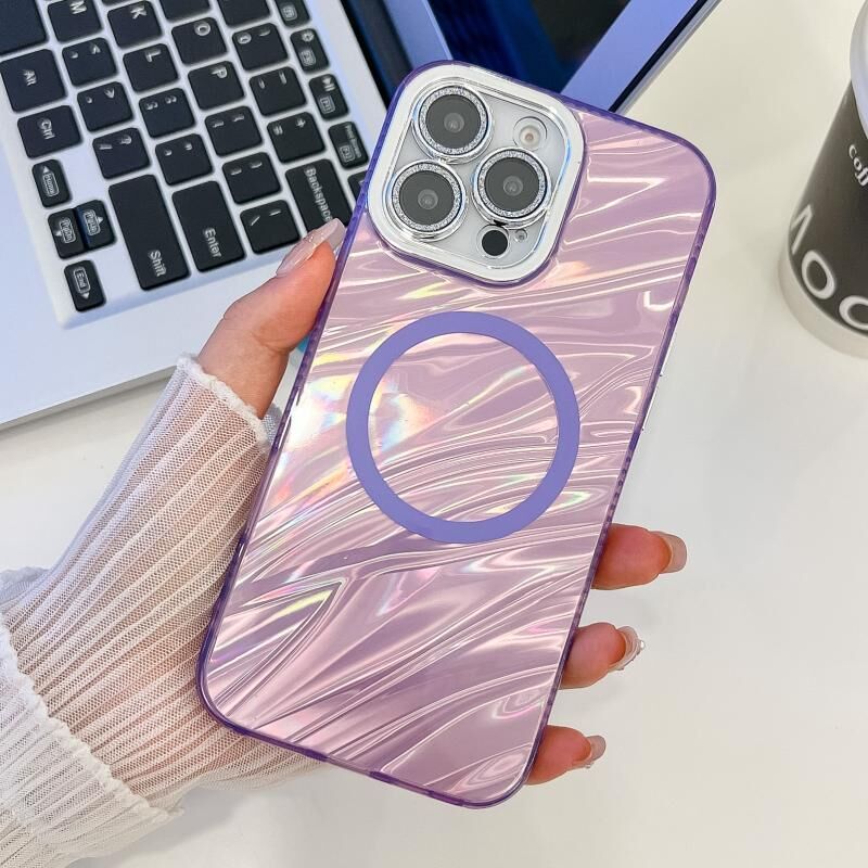 Θήκη τηλεφώνου TPU με επιμετάλλωση, υφή και MagSafe για iPhone 15 Pro Max με προστατευτική μεμβράνη φακού με γκλίτερ (Μωβ Κύματα Νερού)