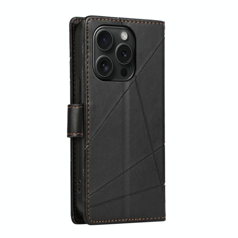 Θήκη τηλεφώνου για iPhone 15 Pro Max από γνήσιο δέρμα PU με ανάγλυφη υφή και λεπτομέρεια γραμμής (Μαύρο)