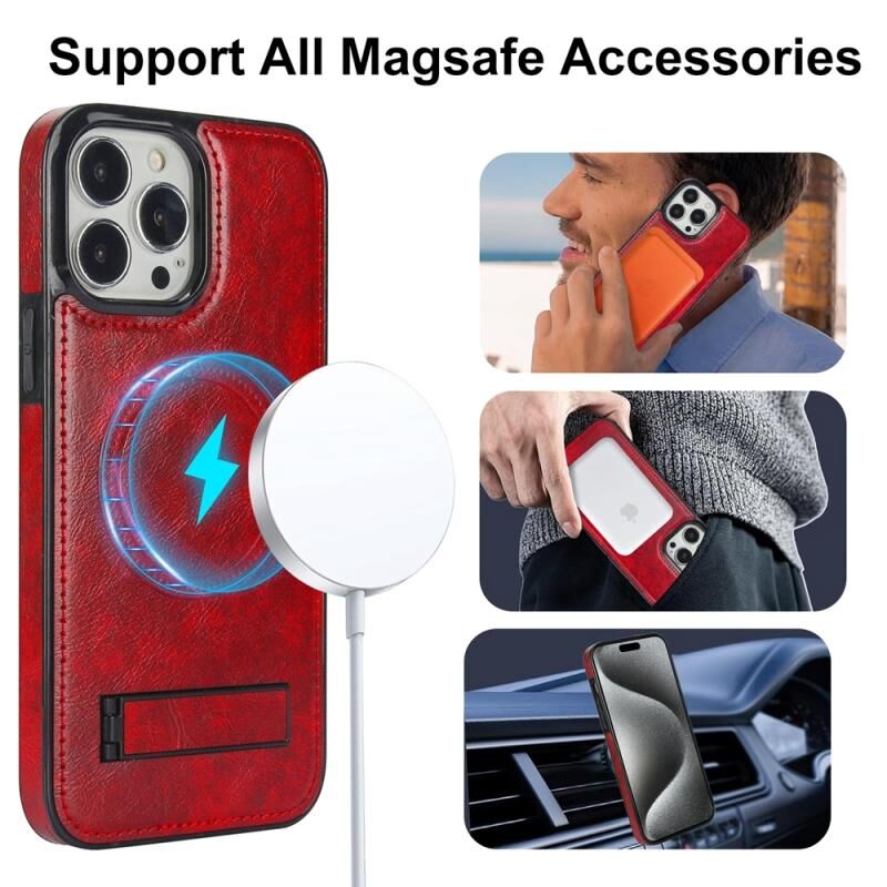 Θήκη τηλεφώνου MagSafe για iPhone 15 Pro Max από δέρμα σε ρετρό στυλ με αόρατο στήριγμα (Κόκκινο)