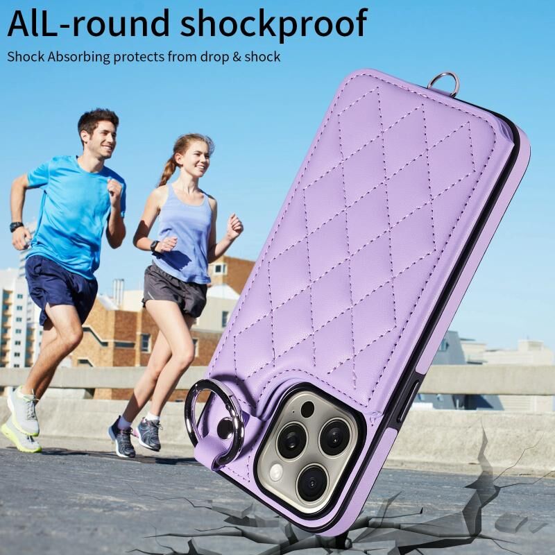 Θήκη τηλεφώνου για iPhone 15 Pro Max με υφή ρόμβου και κάρτα, με κοντό κορδόνι (Μωβ)