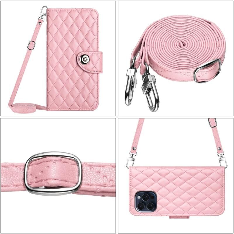 Θήκη τηλεφώνου από δέρμα με ανάγλυφη υφή ρόμβου για iPhone 15 Pro Max με μακρύ κορδόνι (ρόζ)