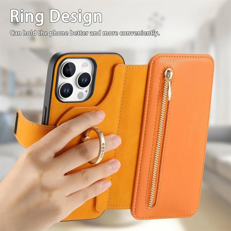For iPhone 15 Pro Max Ring Zipper Wallet RFID Blocking MagSafe Leather Phone Case(Orange)