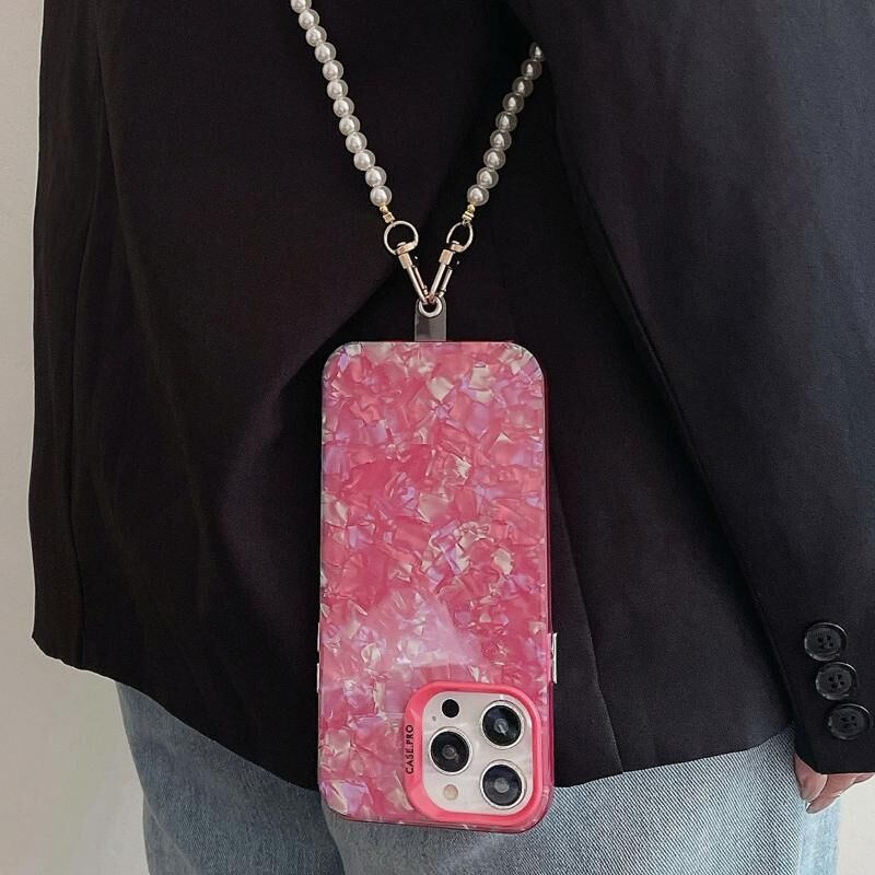 Θήκη για iPhone 15 Pro Max με Υφή Κελύφους, Διαγώνιος Ώμου, Μαργαριταρένια Αλυσίδα, Υβριδική TPU και Ακρυλική (Λευκό)