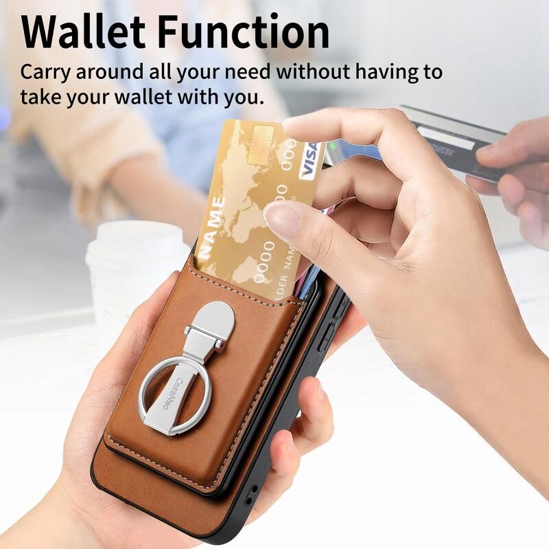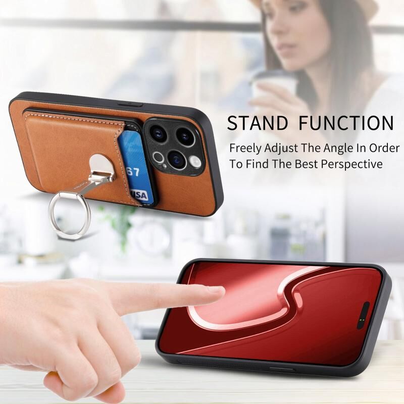 Θήκη τηλεφώνου με μαγνητική βάση, δακτύλιο και θήκη καρτών για iPhone 15 Pro Max (Μαύρο) - Αίσθηση δέρματος. (Καφέ)
