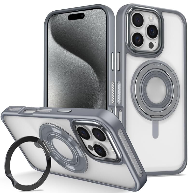 For iPhone 15 Pro Max Skin Feel Transparent 360 Degree Rotating Silicone Ring Holder Phone Case(Grey)