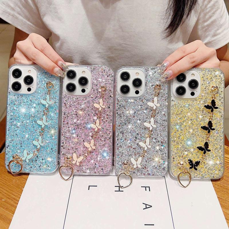 For iPhone 15 Pro Max Starry Sequin Butterfly Chain Epoxy TPU Phone Case(Pink)