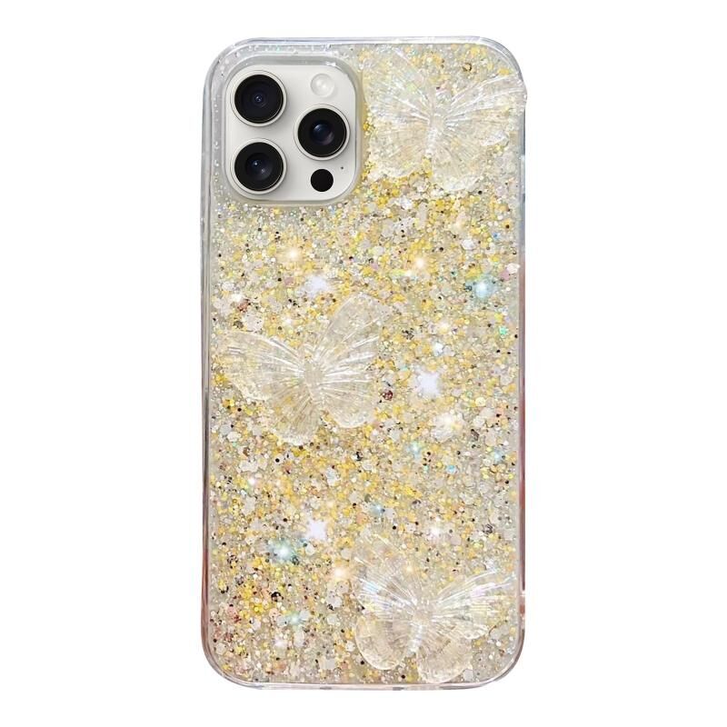 Θήκη κινητού τηλεφώνου για iPhone 15 Pro Max, με λαμπερά στρας, κρύσταλλα, πεταλούδες και εποξειδική ρητίνη TPU (Κίτρινο)