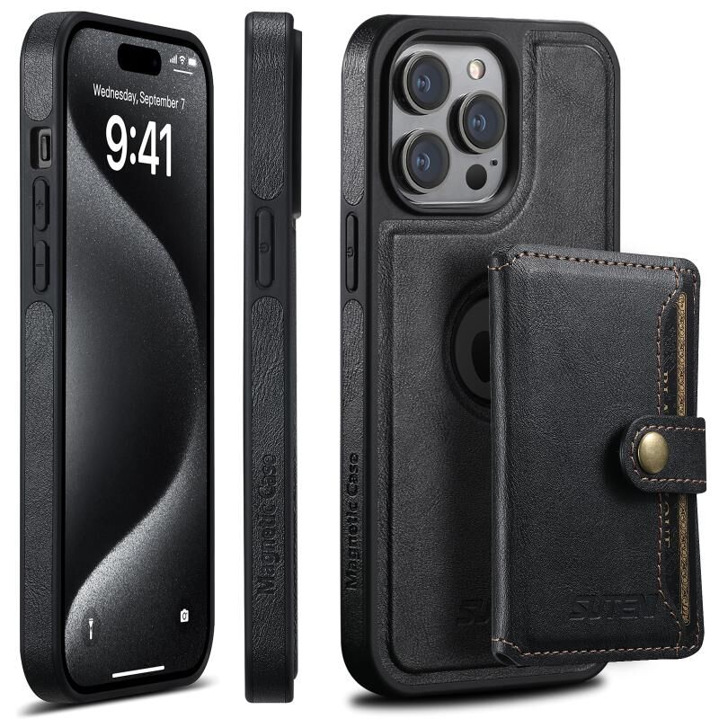 Θήκη τηλεφώνου για iPhone 15 Pro Max Suteni M1 Oil Wax MagSafe αποσπώμενη οριζόντια θήκη καρτών (Μαύρο) (Suteni)