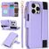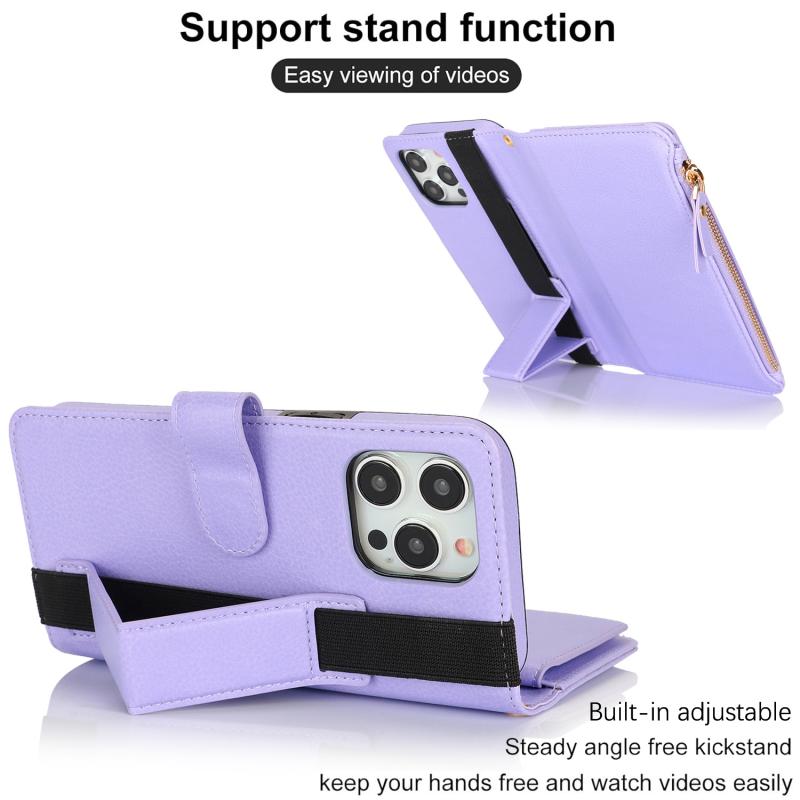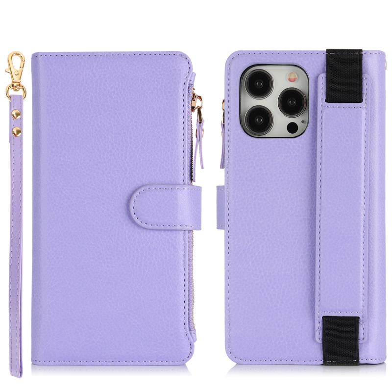 For iPhone 15 Pro Max Wristband Holder Zipper Purse RFID Leather Phone Case(Purple)