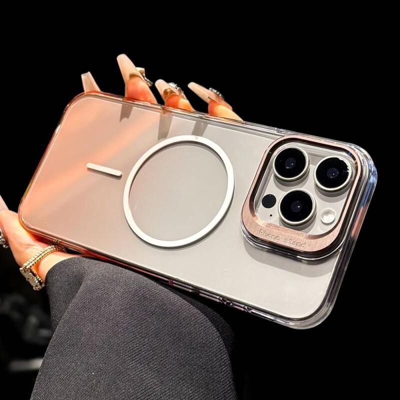 Θήκη τηλεφώνου για iPhone 15 Pro, μεταλλικός φακός, αναδιπλούμενη βάση, διαβαθμισμένο χρώμα, αντικραδασμική, με MagSafe (Χρυσός)