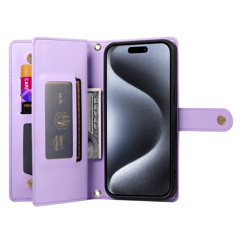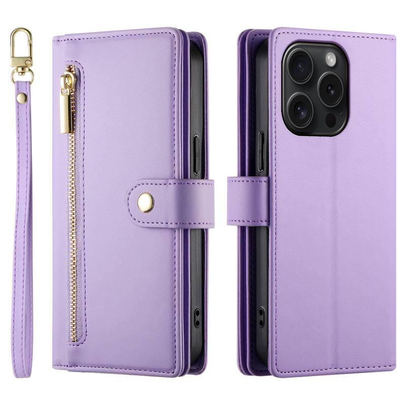 For iPhone 15 Pro Nine Card-slot Zipper Wallet Bag Leather Phone Case(Purple)