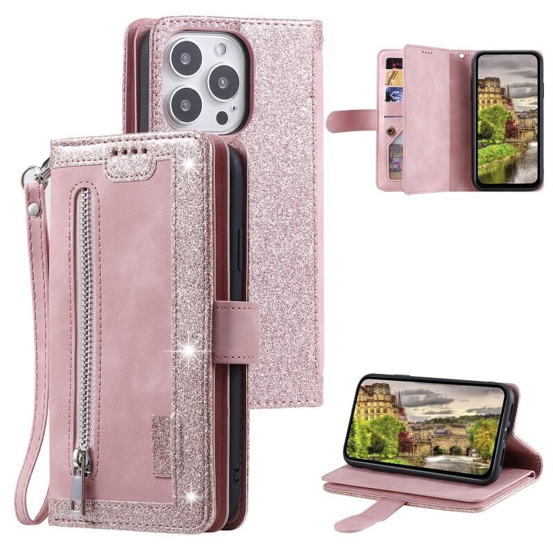 For iPhone 15 Pro Nine Card Zipper Bag Leather Phone Case with Lanyard(Pink)