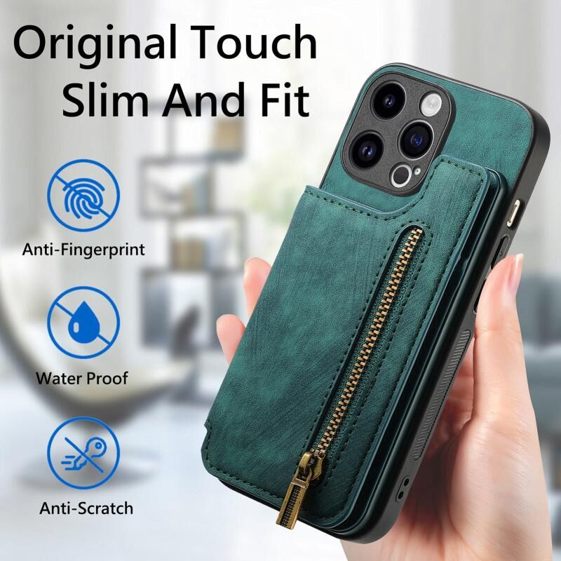 2. Λειτουργία πορτοφολιού με φερμουάρ: Η δερμάτινη θήκη είναι εξοπλισμένη με υποδοχές για κάρτες και ένα μικρό ποσό μετρητών.