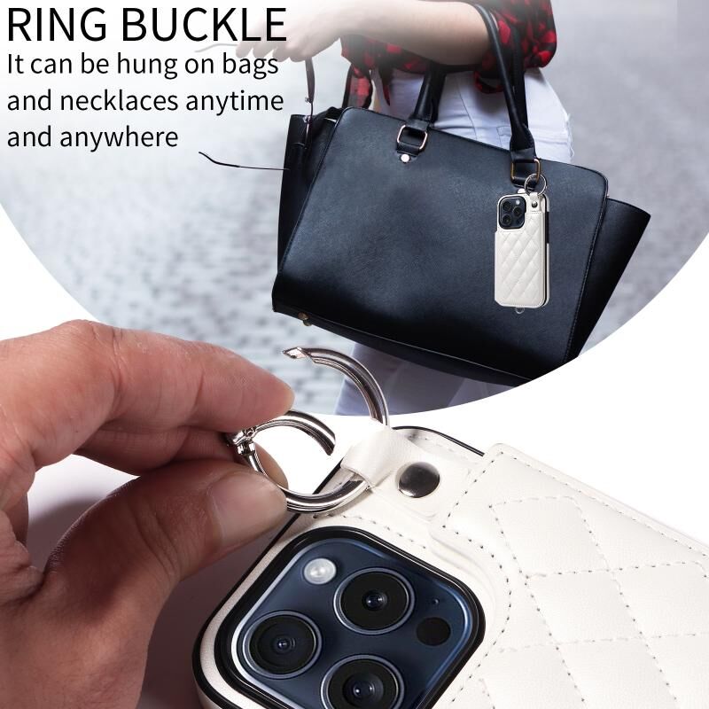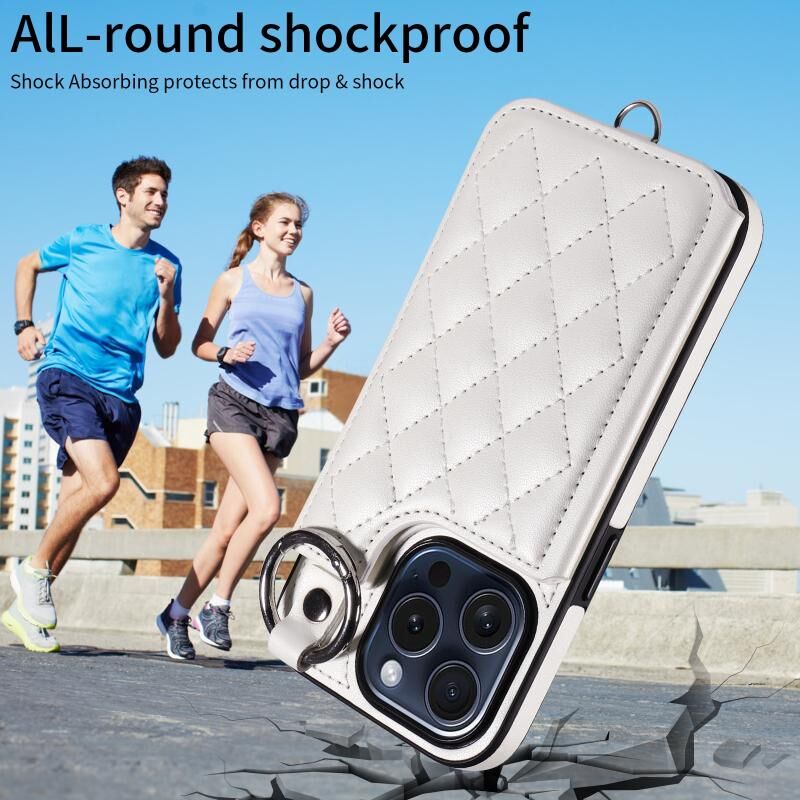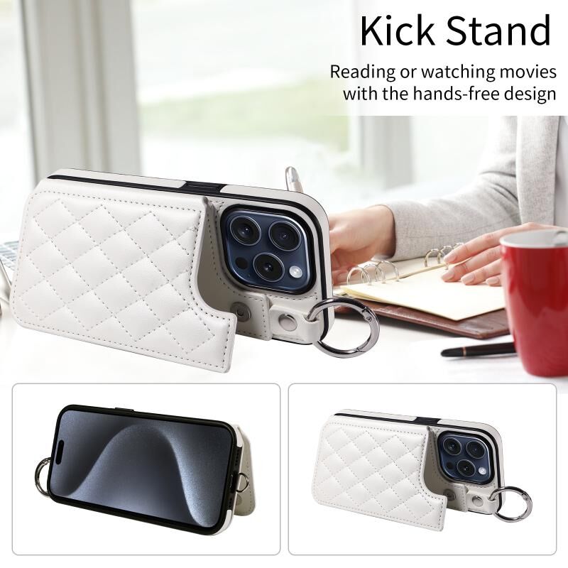 For iPhone 15 Pro Rhombic Texture Card Bag Phone Case with Short Lanyard(White)