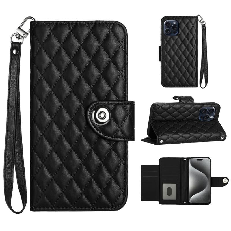 Θήκη τηλεφώνου από δέρμα με ανάγλυφη υφή ρόμβου για iPhone 15 Pro με κορδόνι (Μαύρο)