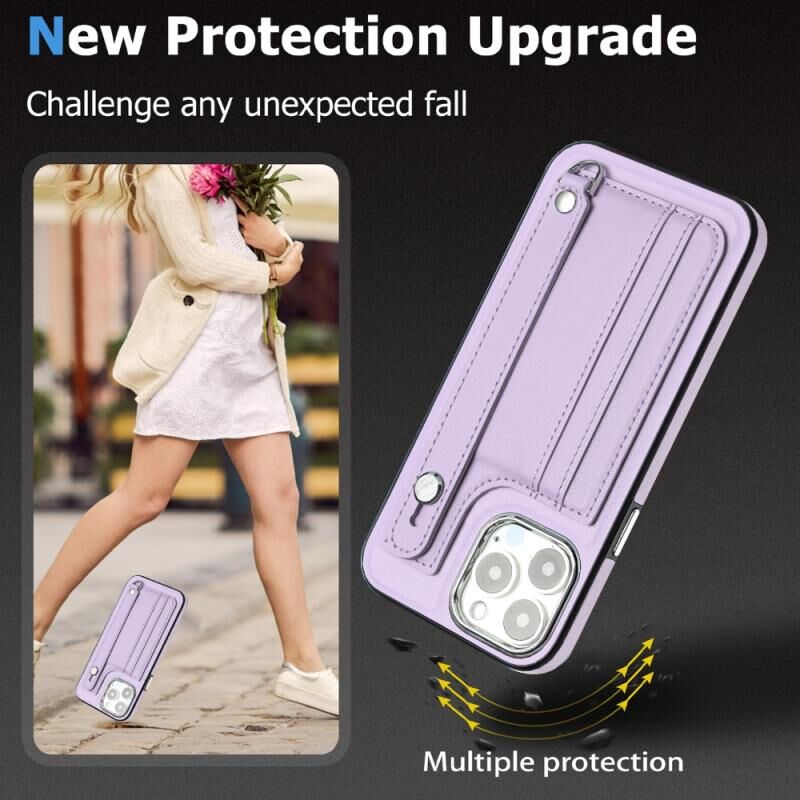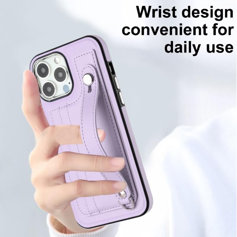 Θήκη για iPhone 15 Pro ανθεκτική στις κρούσεις από δέρμα με λουρί καρπού (Μωβ)