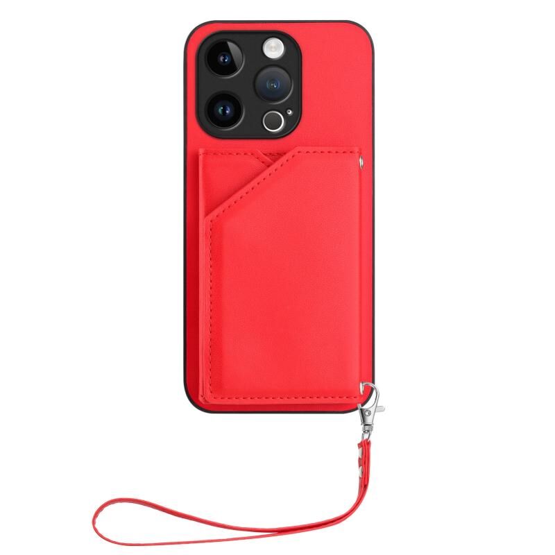 For iPhone 15 Pro Skin Feel Four Card Slots Phone Case with Wrist Strap(Red)