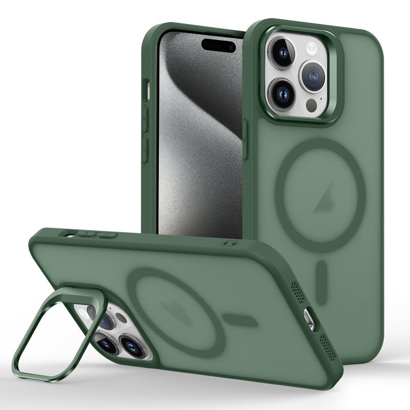 For iPhone 15 Pro Skin Feel Lens Holder Magsafe Phone Case(Deep Green)