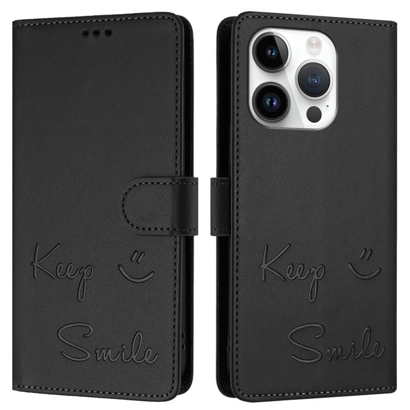 Θήκη τηλεφώνου από δέρμα με ανάγλυφο χαμόγελο για iPhone 15 Pro, με προστασία RFID (Μαύρο)