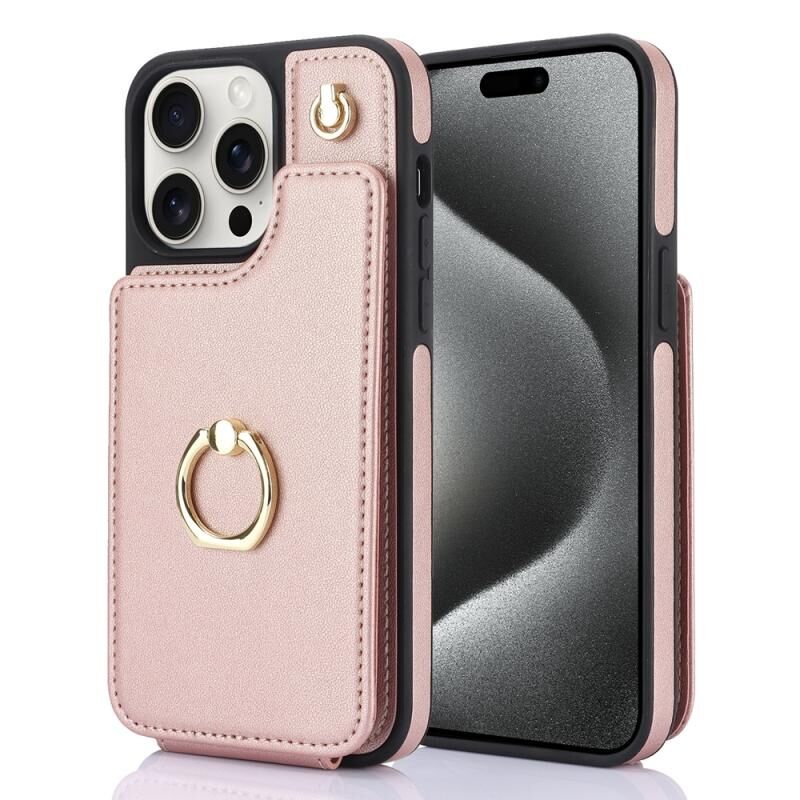 For iPhone 15 Pro YM005 Skin Feel Card Bag Phone Case with Long Lanyard(Rose Gold)