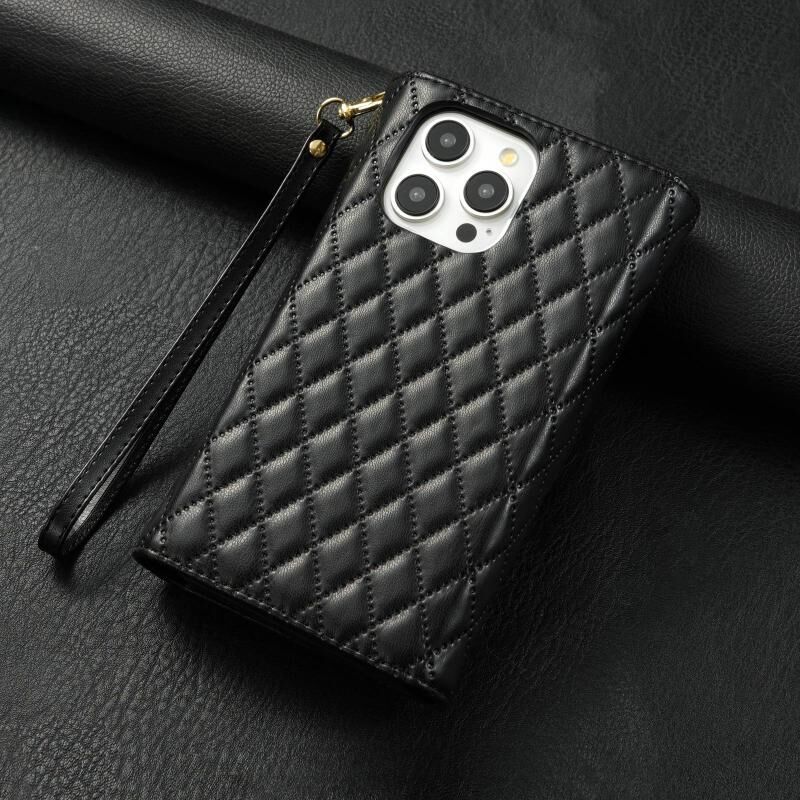 Θήκη τηλεφώνου από δέρμα σε σχήμα ρόμβου με φερμουάρ και πολλαπλές θήκες καρτών για iPhone 15 Pro (Μαύρο)