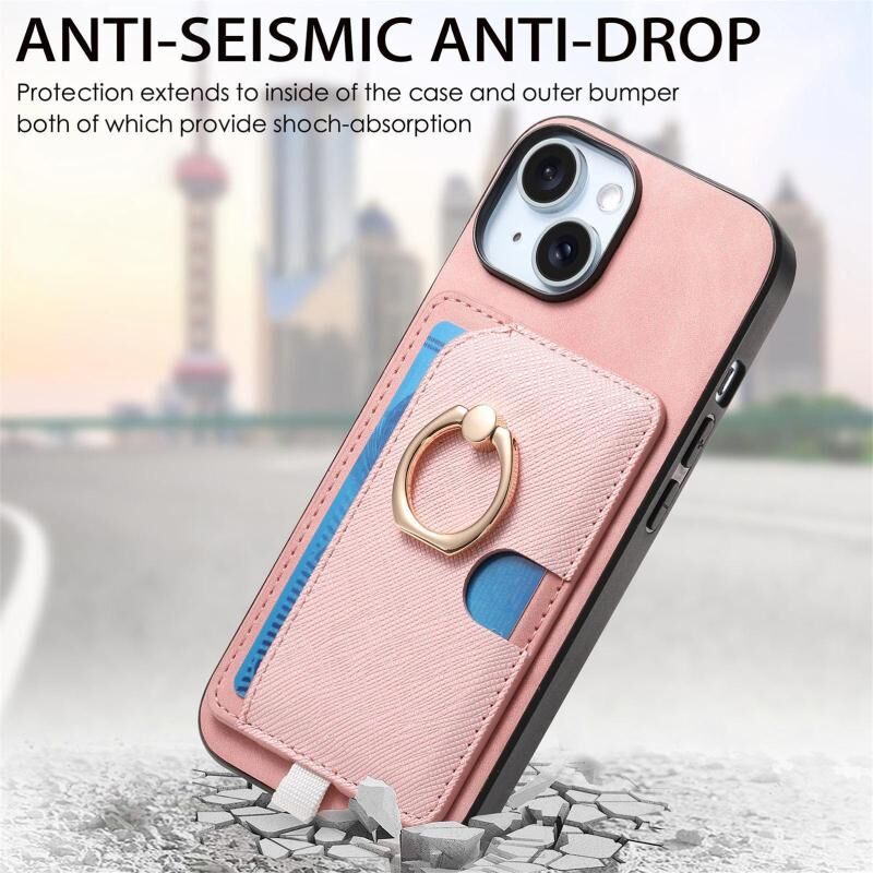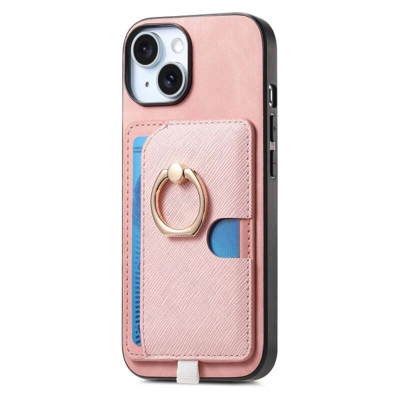 For iPhone 15 Retro Cross Leather Ring Side Insert Card Bag MagSafe Phone Case(Pink)