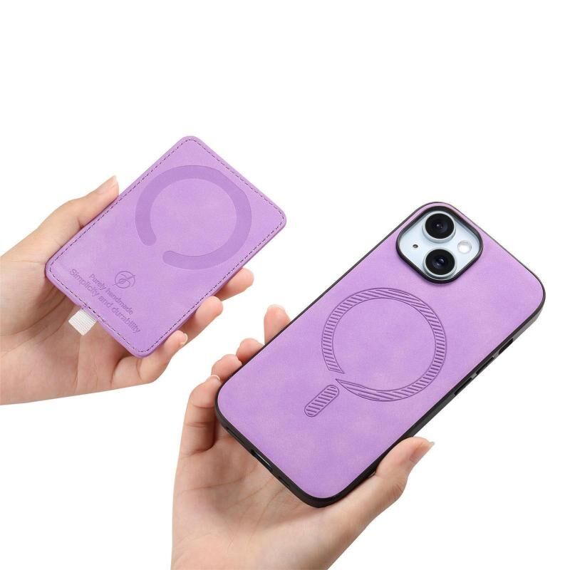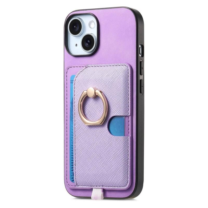 For iPhone 15 Retro Cross Leather Ring Side Insert Card Bag MagSafe Phone Case(Purple)