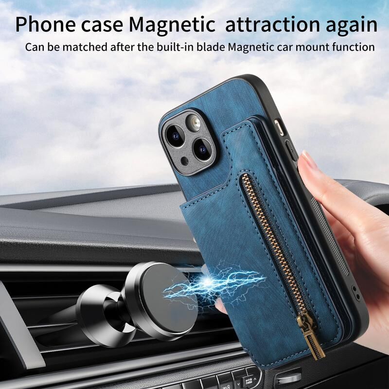 Θήκη κινητού για iPhone 15, δερμάτινη, ρετρό, με φερμουάρ και θήκη πορτοφολιού (Μπλε)