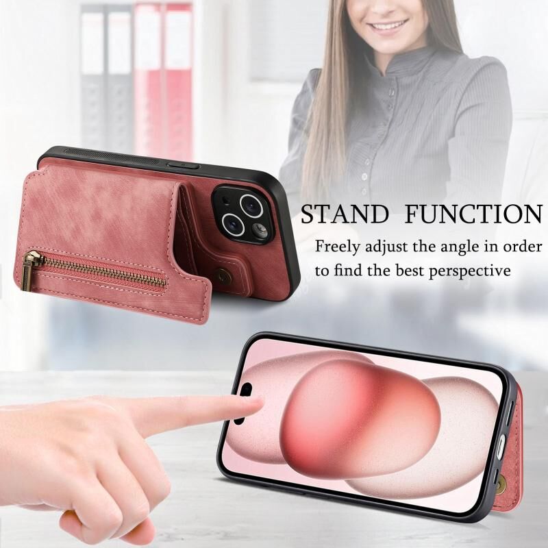 Θήκη για iPhone 15, Δερμάτινο Ρετρό Πορτοφόλι με Φερμουάρ, για την Πλάτη του Τηλεφώνου (ρόζ)