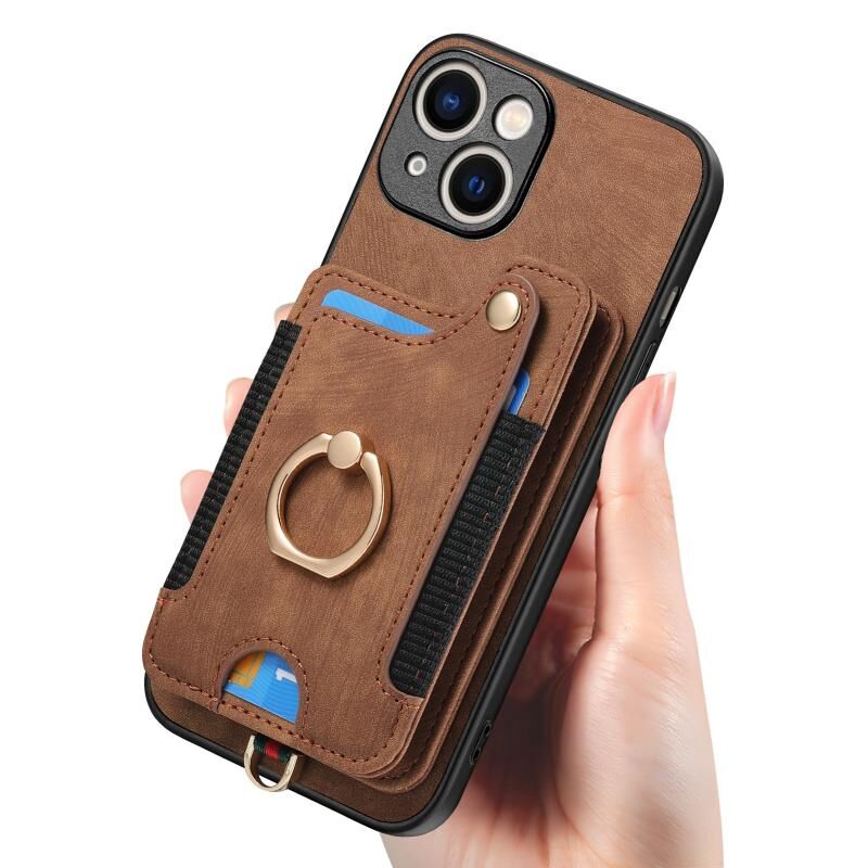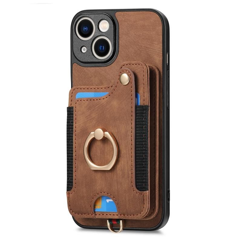 Θήκη τηλεφώνου για iPhone 15 με ρετρό υφή, δακτύλιο και πολλαπλές θήκες καρτών (Ροζ)