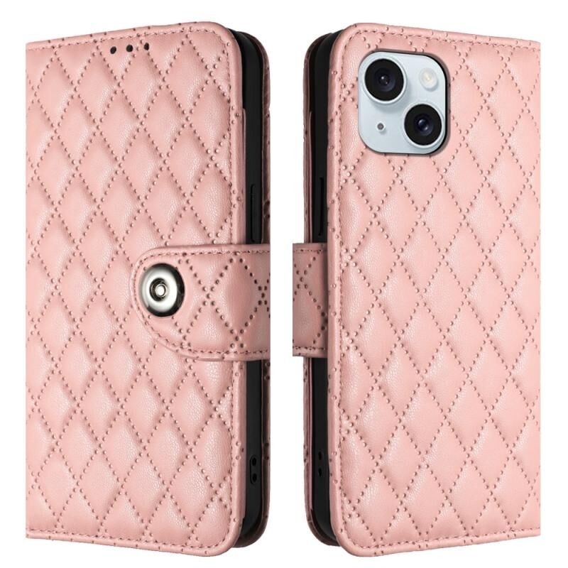 Θήκη τηλεφώνου από δέρμα με ανάγλυφη υφή ρόμβου για iPhone 15 με κορδόνι (Κοραλλί ροζ)