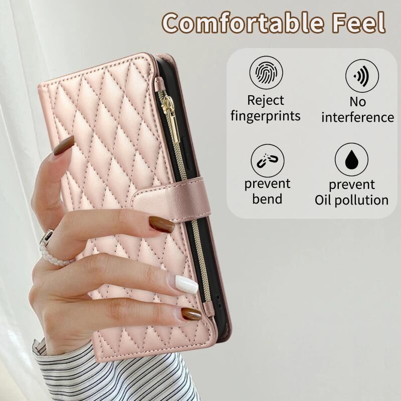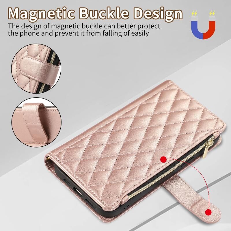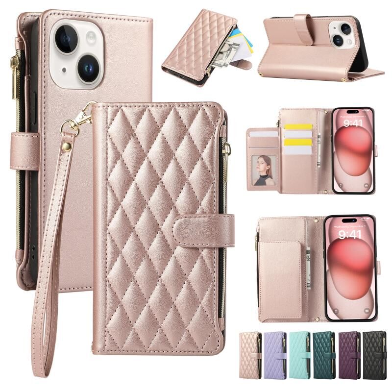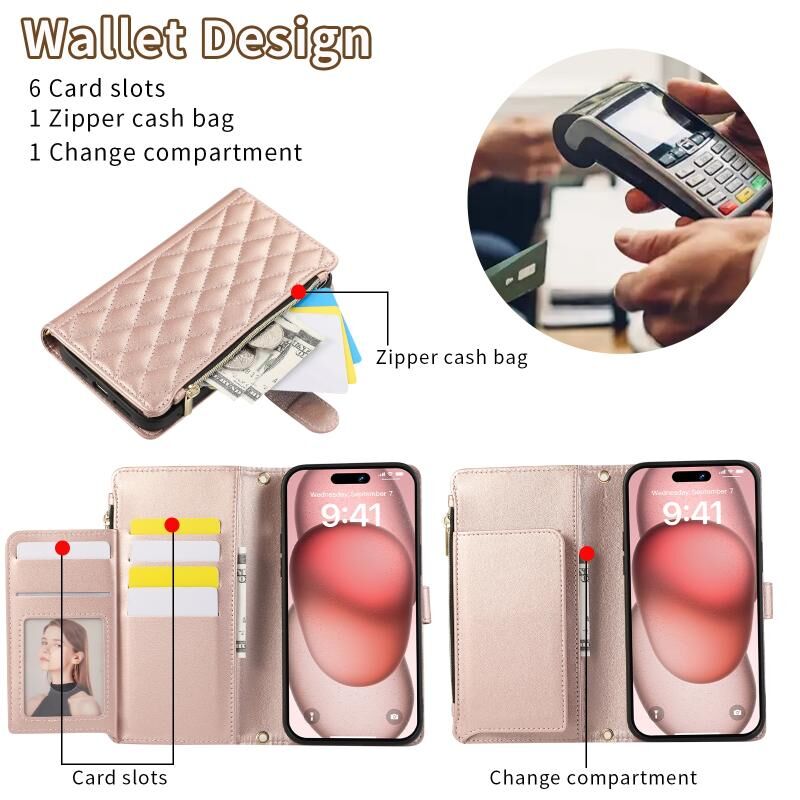 Θήκη τηλεφώνου από δέρμα με φερμουάρ και ρόμβους για iPhone 15 (Ροζ χρυσός)
