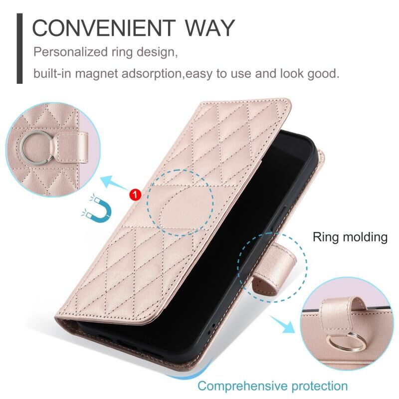 Θήκη τηλεφώνου από δέρμα με ρομβικό σχέδιο και μεταλλικό δακτύλιο για iPhone 15 (Ροζ χρυσός)