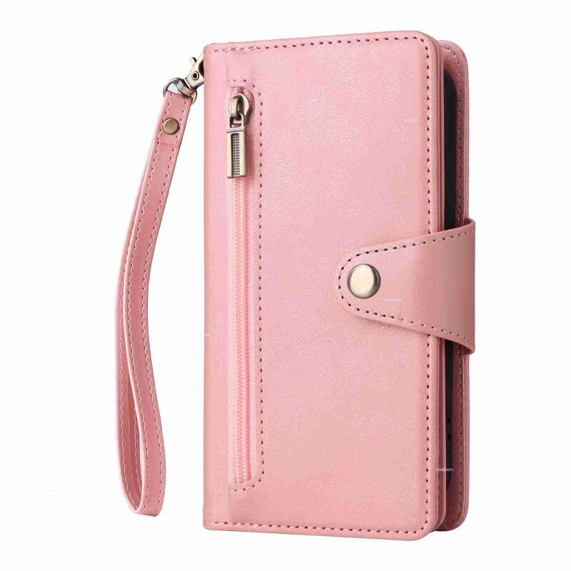 For iPhone 15 Rivet Buckle 9 Cards Three Fold Leather Phone Case(Rose Gold)