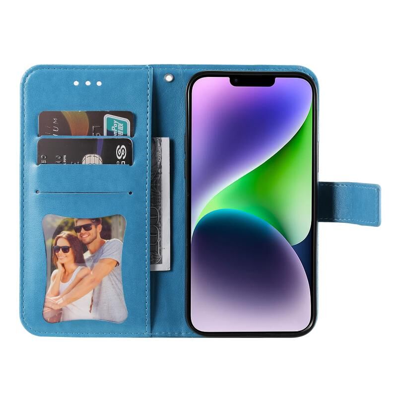 For iPhone 15 Seven-petal Flowers Embossing Leather Phone Case(Blue)